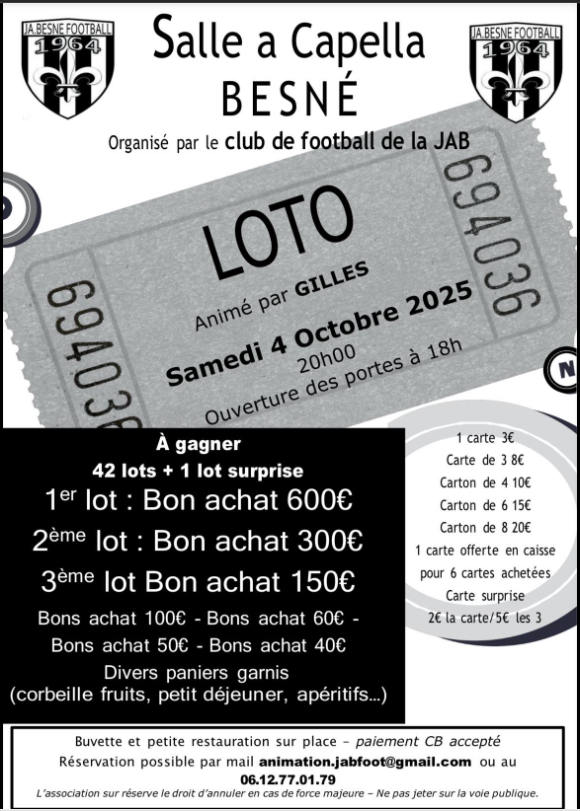 Le club organise son premier LOTO le Samedi 4 Octobre 2025 à la salle A CAPELLA animé par GILLES.